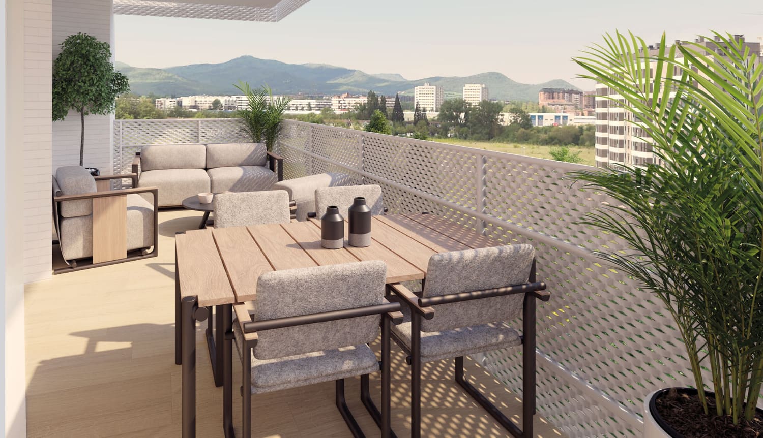 Los pisos en plantas elevadas, también ofrecen terrazas cubiertas con acceso al salón – cocina para que puedas disfrutar de un salón exterior y las preciosas vistas.