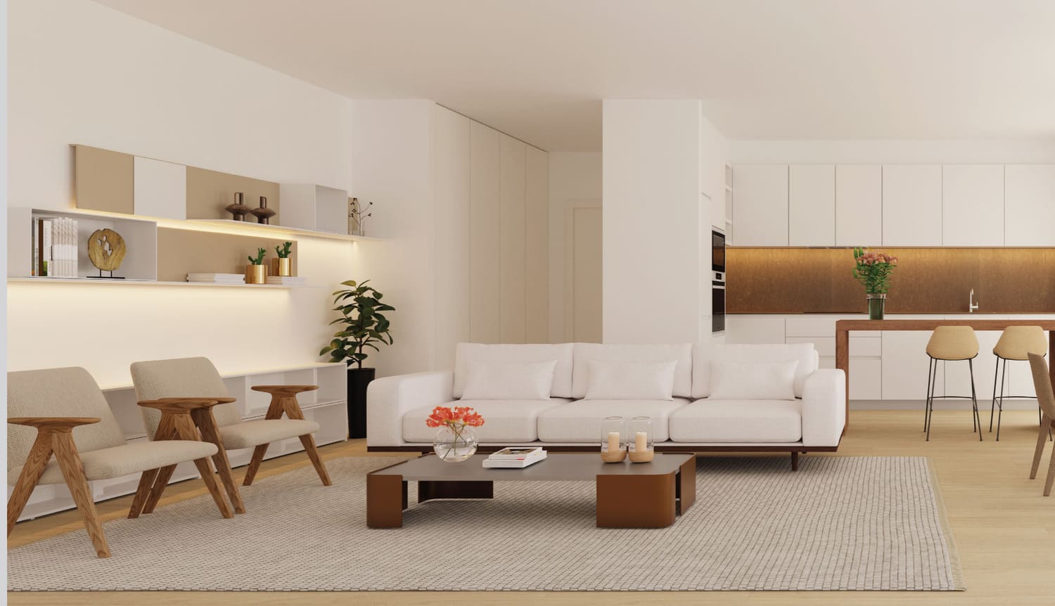 Hemos prestado especial interés en diseñar interiores que optimizan los distintos usos, y se unifican en un mismo espacio. Todas las viviendas se han concebido con zona de día abierta, fusionando salón, comedor, cocina y terraza.