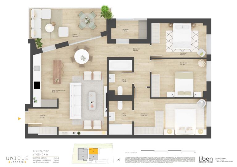 UNIQUE LARREIN te ofrece viviendas de 2, 3 y 4 dormitorios, bajos ajardinados y áticos, todas ellas con distribuciones muy pensadas para adaptarse a tus necesidades, y con amplias terrazas para disfrutar de la calma y armonía que aporta su entorno. Disponibles con plazas de garaje y trastero.