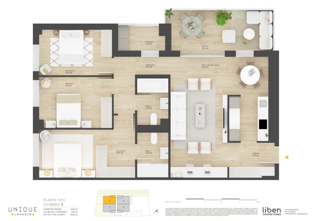 SUP. ÚTIL= 88,90m² + 16,65m² de Terraza