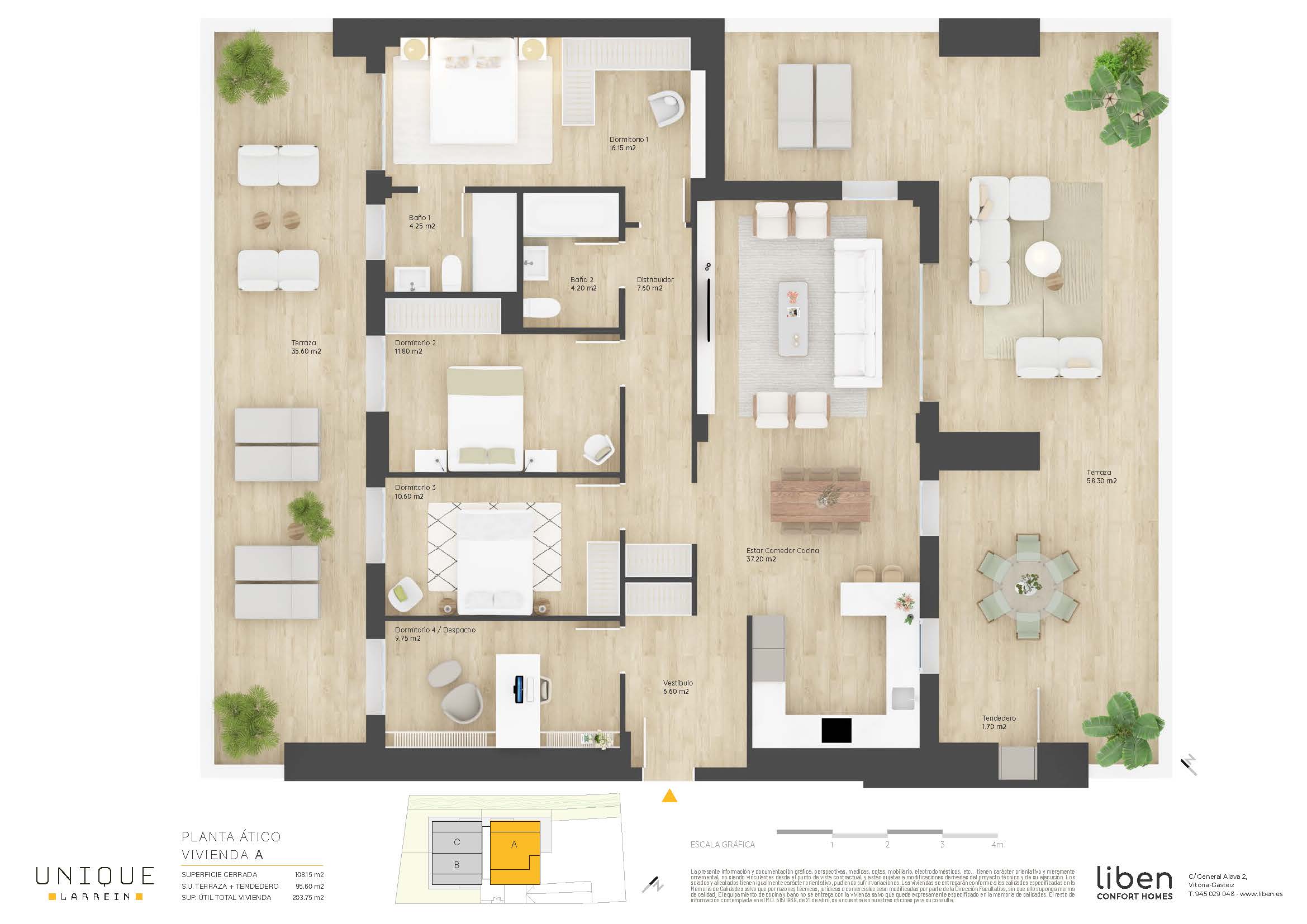 SUP. ÚTIL= 108,15m² + 95,60m² de Terraza