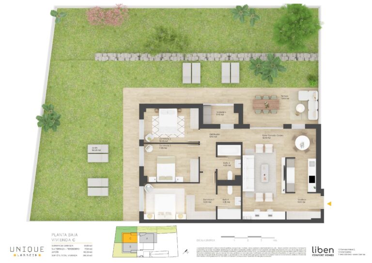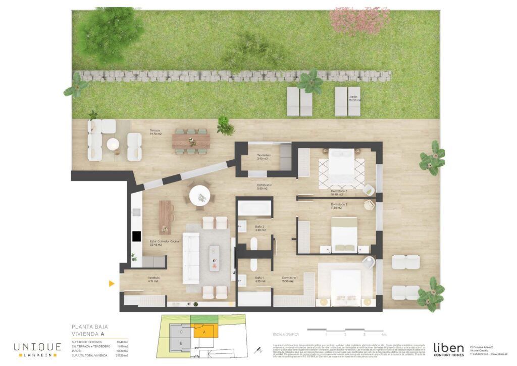 SUP. ÚTIL= 88,90m² + 17,20 de Terrazas + 182,20m² de Jardín